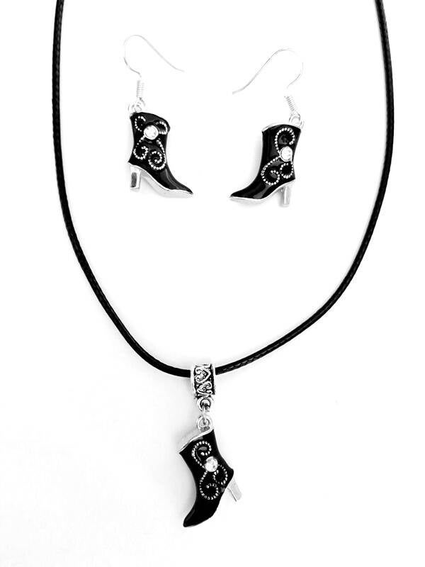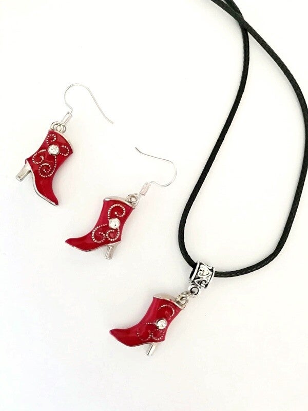 - d'un collier d'environ 45cm avec chaînette d'extension en métal argenté et simili cuir et un pendentif botte emaillée de 2cm.