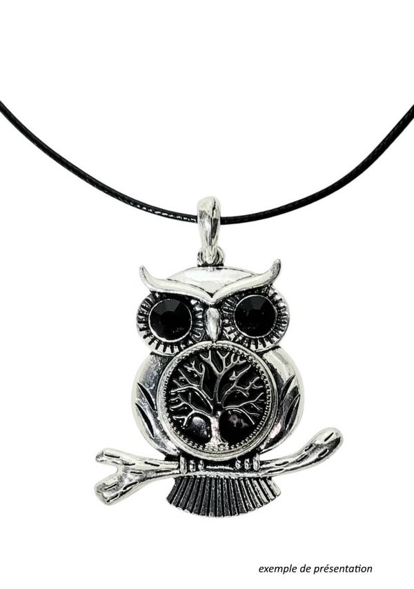 collier d'environ 45cm avec chaînette d'extension en métal argenté et simili cuir. Couleur des yeux noir